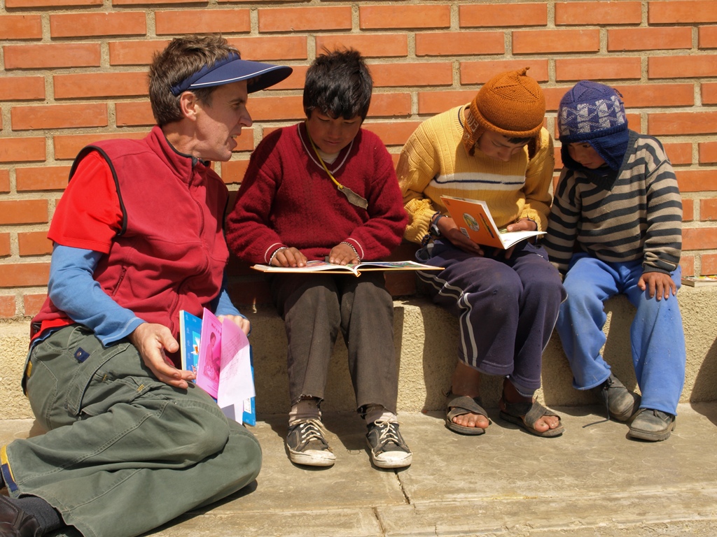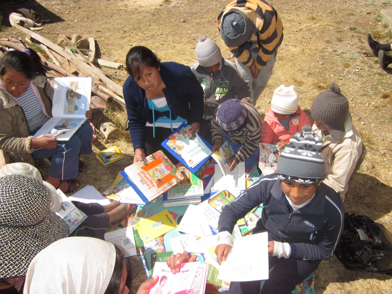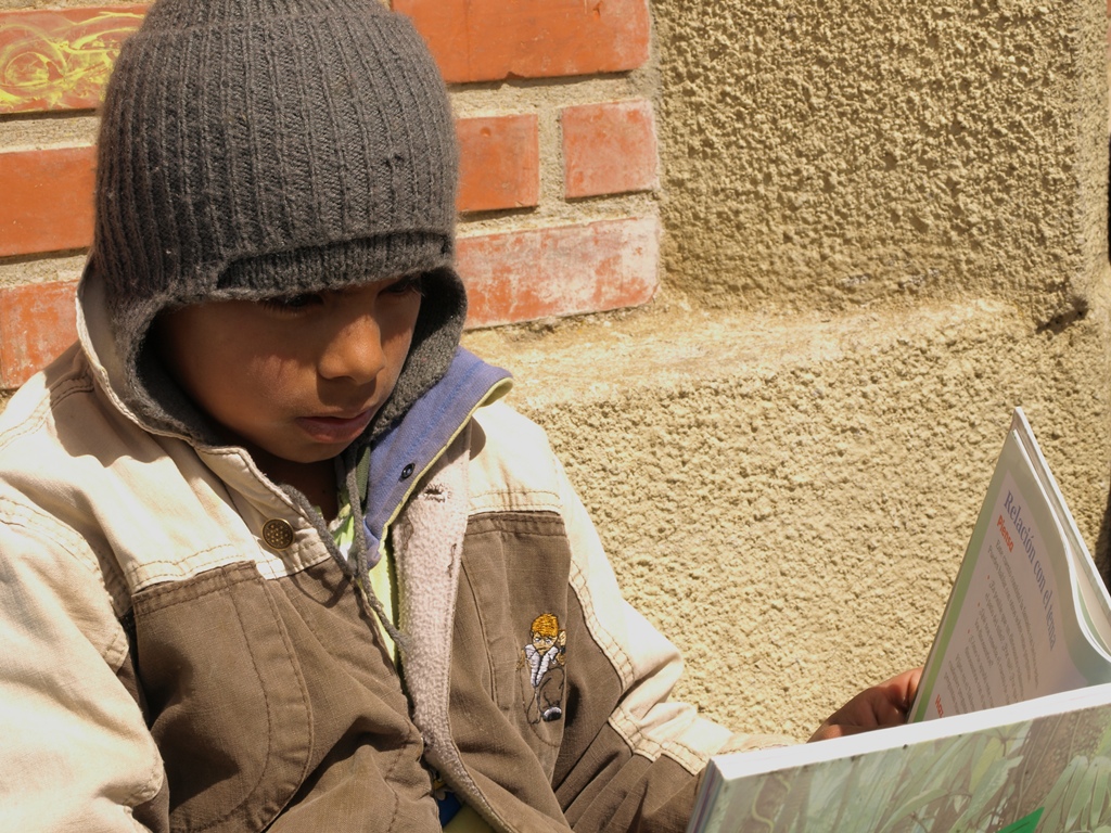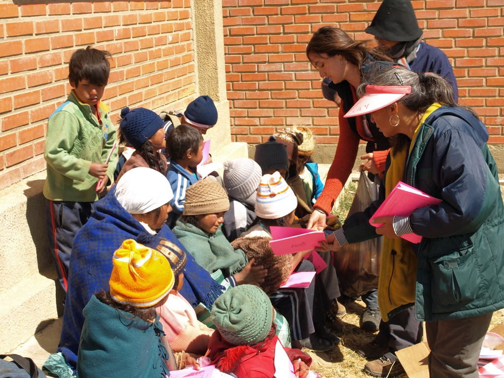 Yesterday was our second Saturday of books and games with the kids of Sancayani. Along with big bags full of mandarinas, bananas and bread, we loaded a few heavy boxes full of books into the back of the car and drove up to 14,000 feet to meet them in their schoolyard. As we bumped along the road at about 10:30, we came into sight of the school and the ten or fifteen kids waiting for us leapt up and ran towards us. A few pretended to hide behind the whitewashed pillars and in the door frames in shyness, but peeked out, smiling, as we hopped out of the car. It was sunny but the wind was cold, and so strong that it kept blowing our hats off of our heads. At Blanca’s (Blanca works in the Mano a Mano Internacional office in Bolivia) bidding, the kids led us behind the building to where the wind was less bitter. Perched on logs, rocks and concrete ledges, we gave the older students pencils and word-finds that Tracy (a volunteer from Europe) had put together while Blanca helped the younger kids glue together foam cutouts to make churches and bells.